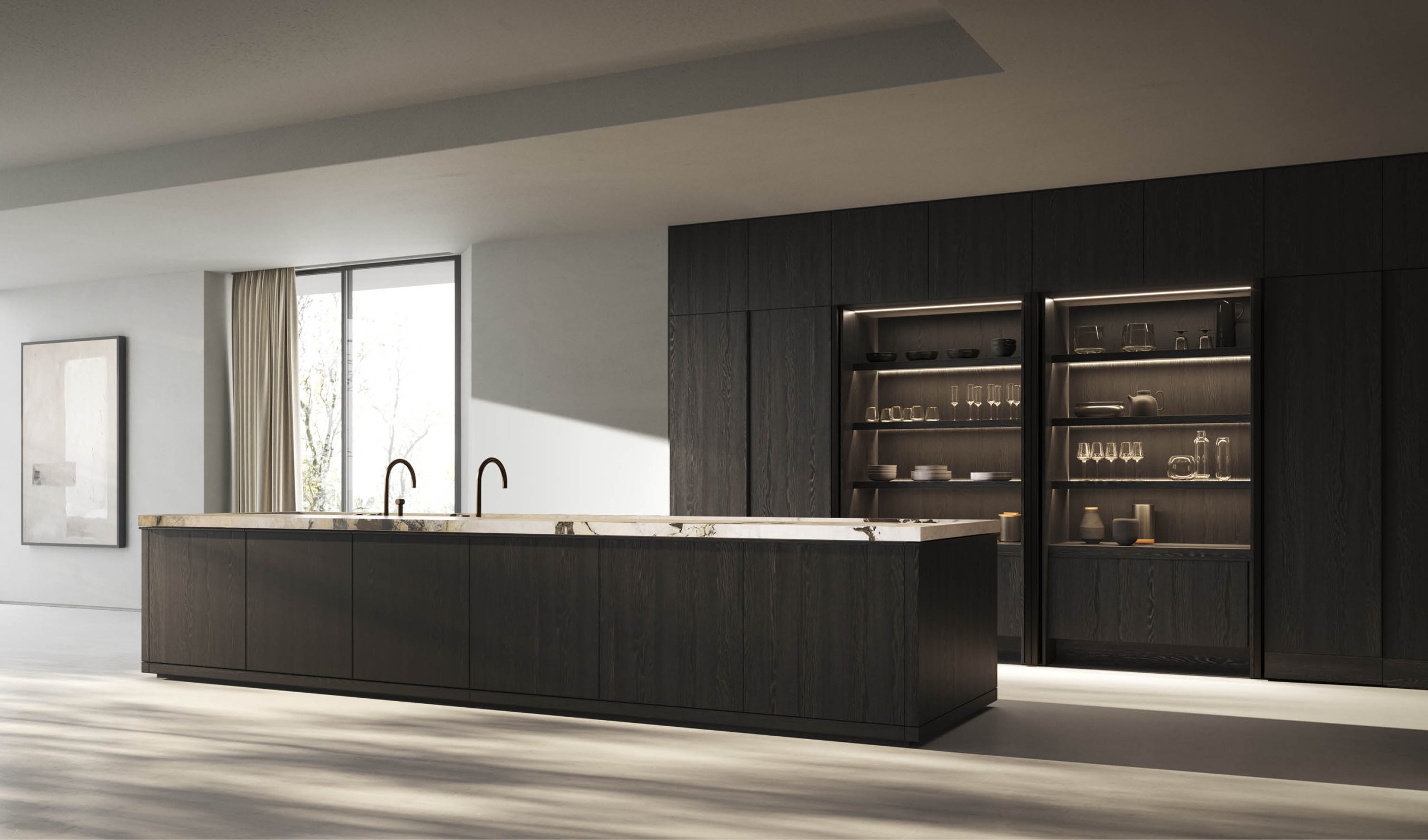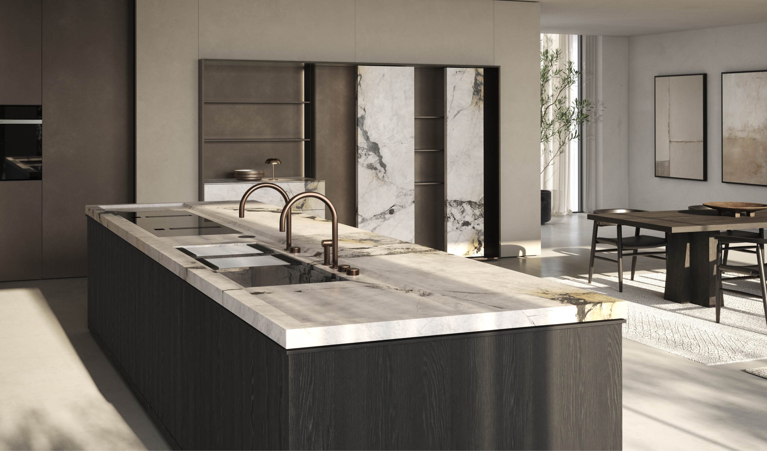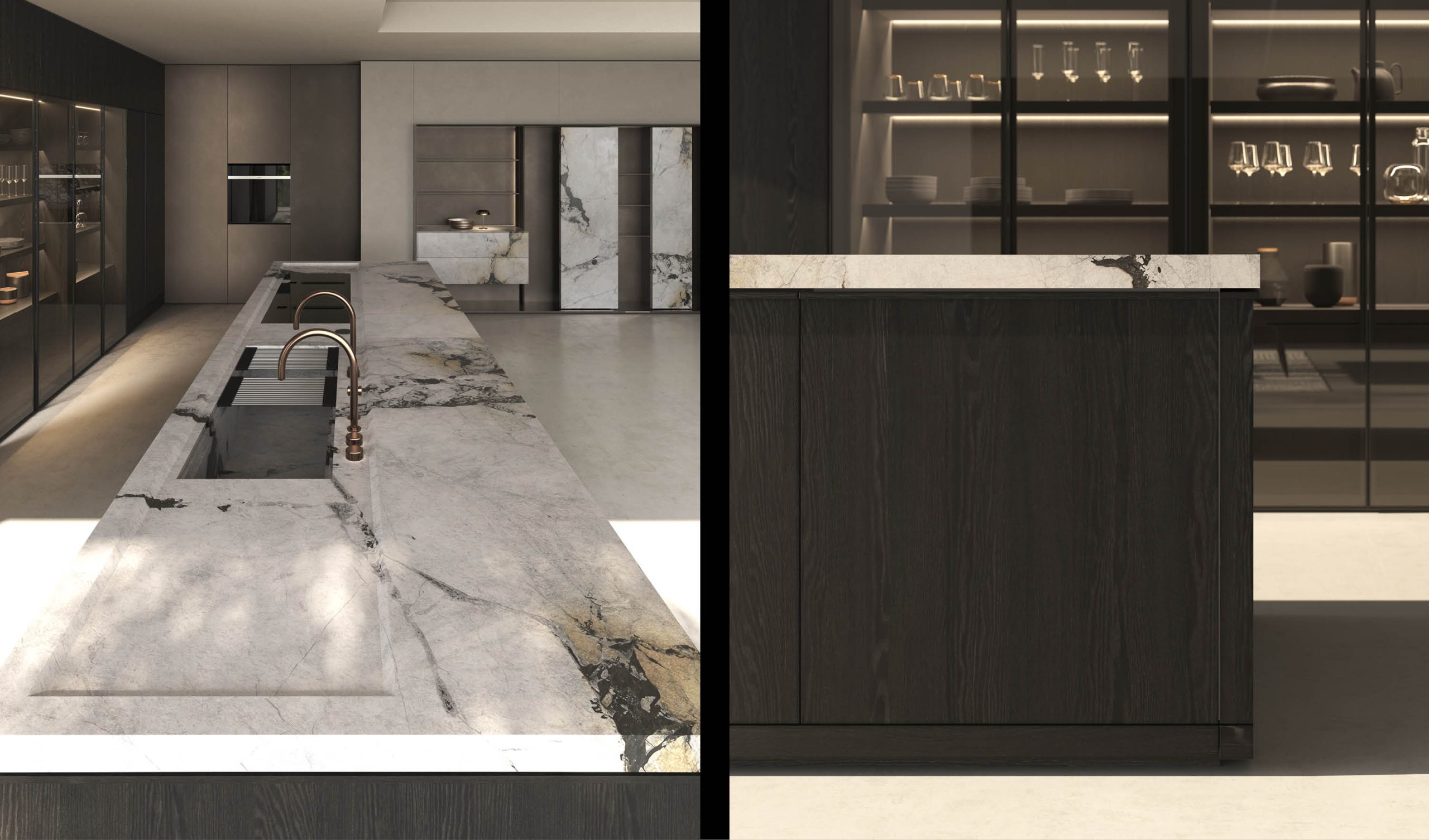 - L’Isola come fulcro: Realizzata in rovere fossile coffee, accoglie un piano in marmo calacatta iron dalle venature profonde che richiamano le tonalità calde del legno.