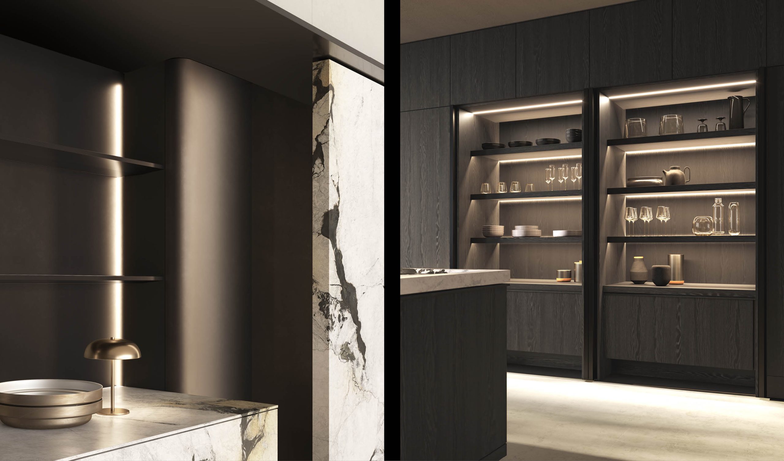 - L’illusione della sospensione: Il basamento, ripensato come una cornice strutturale arretrata, alleggerisce visivamente l’importante volume dell’isola. Non una semplice chiusura tecnica, ma un accorgimento progettuale che conferisce al blocco una sospensione quasi architettonica.